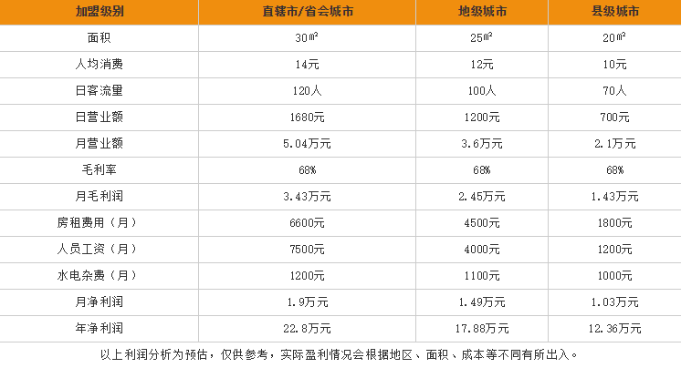 从以上可以看出,在省会城市开一家面积为30㎡的桃园灌汤包一年净利润为22.8万元;在地级城市开一家面积为25㎡的桃园灌汤包一年净利润为17.88万;在县级城市开一家面积为25㎡的桃园灌汤包一年净利润为12.36万元。由此可见,桃园灌汤包的利润空间还是很大的。既然有利润,当然也有成本的投入,加盟桃园灌汤包需要的加盟费是多少,可以在好生意加盟网中具体了解。