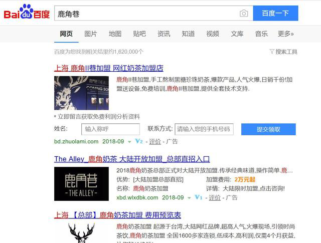 百度一下,前五个是鹿角巷招商加盟的广告,点进去一问,五个均宣传自己总部在上海,但其中有三家说自己的公司叫广州XX公司(三家名称各不相同),一家名称未透露,还有一家称自己的公司名称就叫“鹿角巷加盟总部”。看来度娘忙着数钱,没空搭理我。