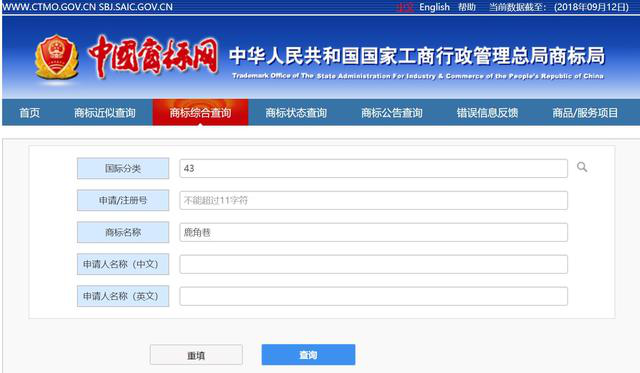 查询结果:目前商标局在43类(餐饮住宿)上收到了131项“鹿角巷”商标申请,最早的一份申请是台湾同胞邱茂庭于2017年8月1日提交的,已被驳回,目前复审中。其余商标都还在审查,未核准注册。