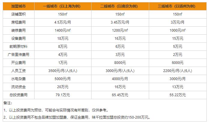 以上可以看出,味千拉面加盟在一线城市(以上海为例)需要79.1万元、二线城市(以南京为例)需要65.45万元、三线城市(以扬州为例)需要55.22万元。