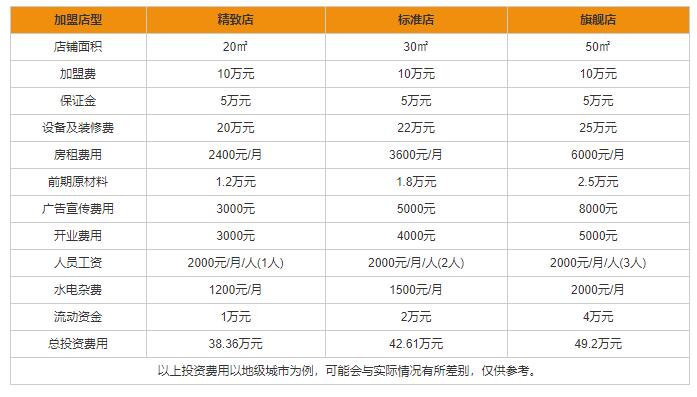 从上表中可以看到,快乐柠檬加盟在精致店需要38.36万元、标准店需要42.61万元、旗舰店需要49.2万元。