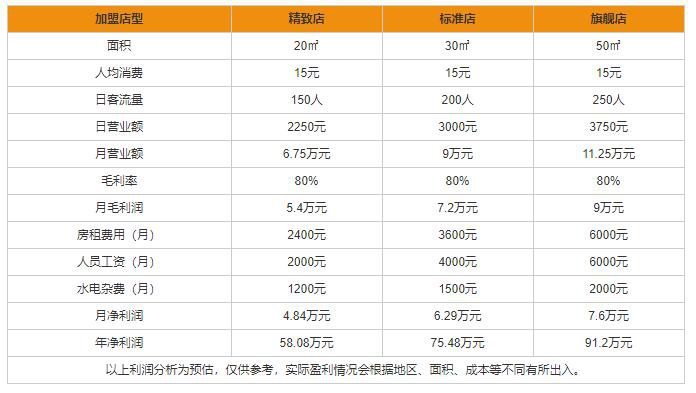 看完了上表,我们可以了解到快乐柠檬加盟利润在精致店月利润是4.84万元,年利润是58.08万元、标准店月利润是6.29万元,年利润是75.48万元、旗舰店月利润是7.6万元,年利润是91.2万元。相信您如果真的经营一家快乐柠檬加盟店,照此发展一定能很快就回本了。